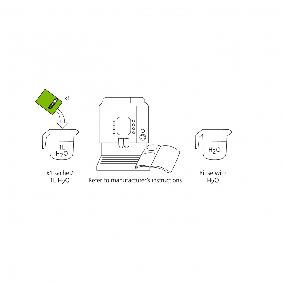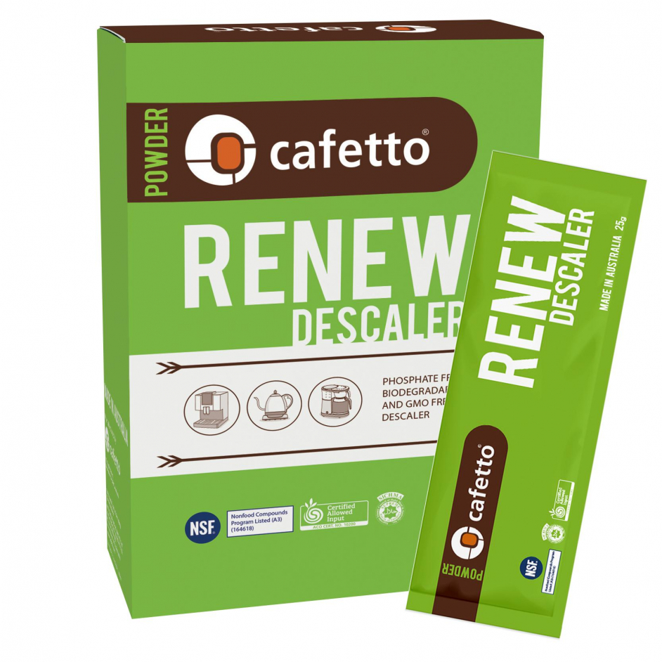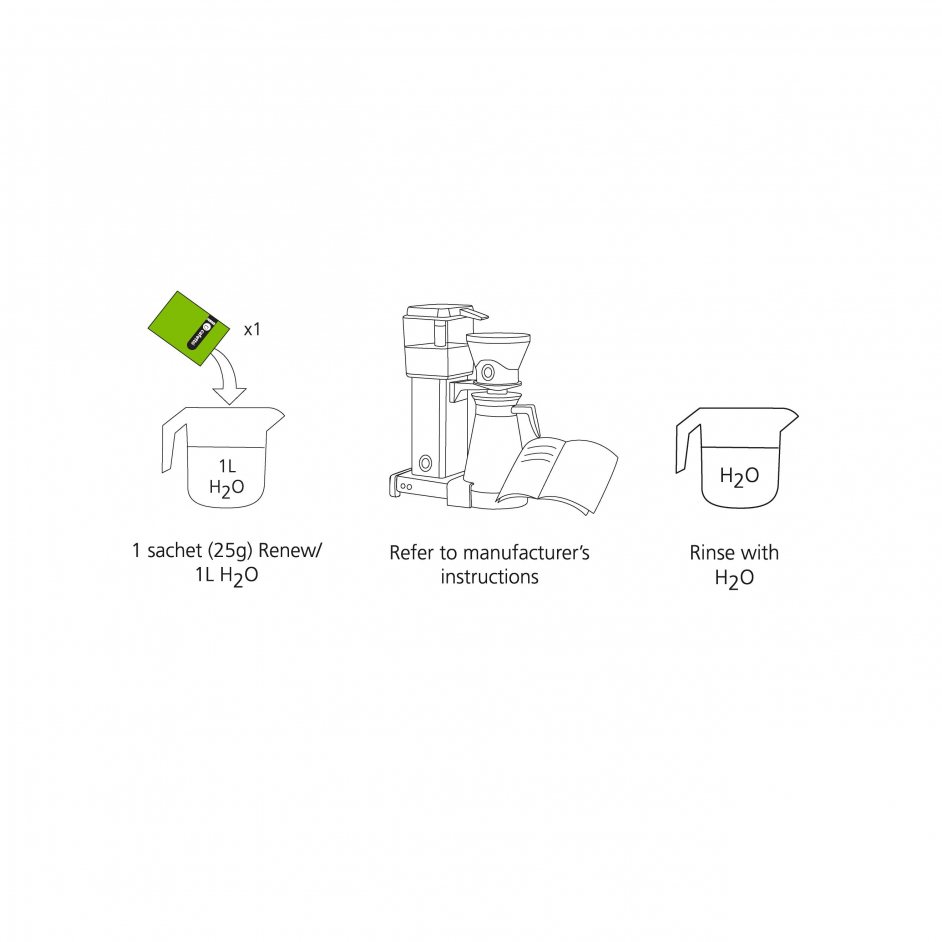 Renew wordt aanbevolen voor het verwijderen van kalkaanslag van espressomachines, koffie- en melkafgifteleidingen, huishoudelijke koffiemachines en waterkokers.