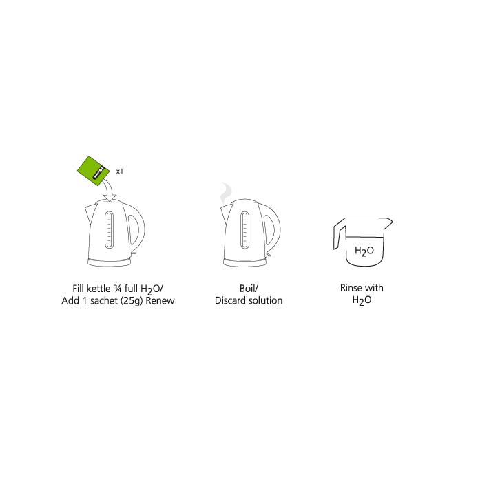 - Voeg 1 zakje (25g) Renew Ontkalker toe
