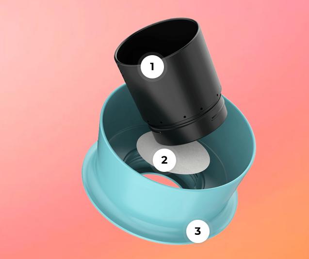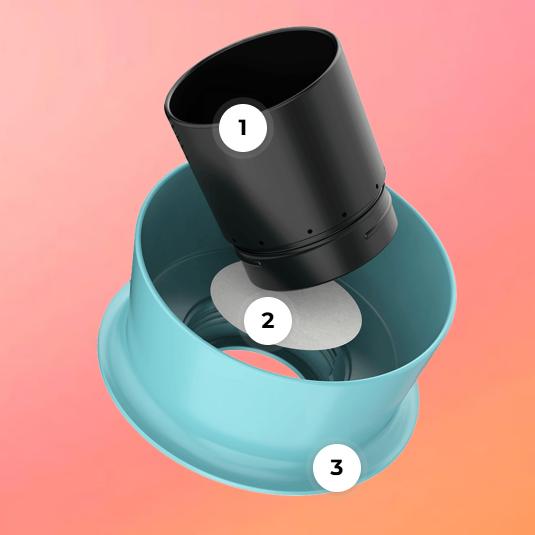 Aan het einde van de extractie hoeft u, om het papieren filter en de koffie te verwijderen, alleen maar de Flow Tower iets los te schroeven van de buitenste ring. Het papieren filter komt er dan gemakkelijk uit!