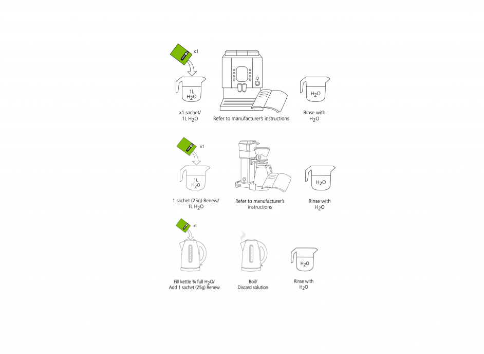 *Dit zijn geregistreerde handelsmerken van hun respectievelijke eigenaren en zijn niet geassocieerd met Cafetto®. Renew wordt aanbevolen voor het verwijderen van kalkaanslag van espressomachines, koffie- en melkafgifteleidingen, huishoudelijke koffiemachines en waterkokers.